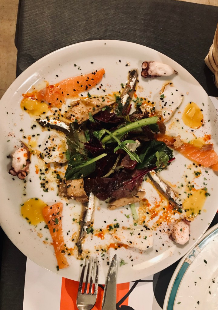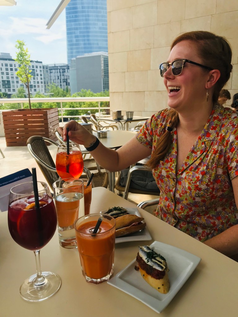Note the fresh gazpacho and anchovy pintxos (tapas) that accompanied our afternoon sangria and spritz. Don’t miss it at the Guggenheim Museum’s cafe in Bilbao. Absolutely delicious.